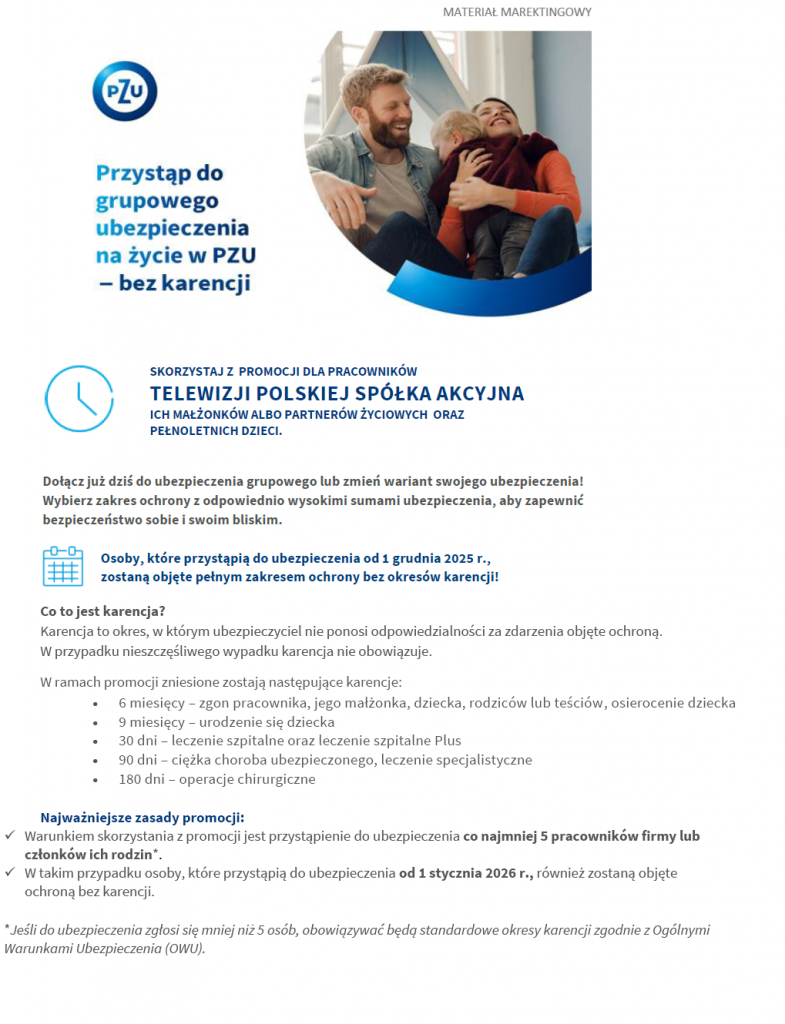 Informujemy, że w sprawie oferty PZU skierowanej do pracowników TVP S.A. w likwidacji, o której informowaliśmy za zgodą Pracodawcy przez pocztę służbową nasz związek NSZZ Solidarność TVP S.A. nie jest zaangażowany w obsługę tej oferty. Informacja przekazana w związku z faktem, że jest to oferta przygotowana dla pracowników TVP S.A. w likwidacji.