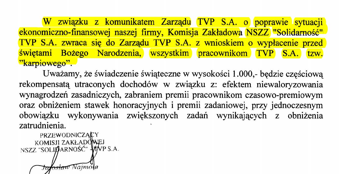 LIST OTWARTY PRZEWODNICZĄCEGO NSZZ SOLIDARNOŚĆ TVP S.A. DO WŁADZ SPÓŁKI