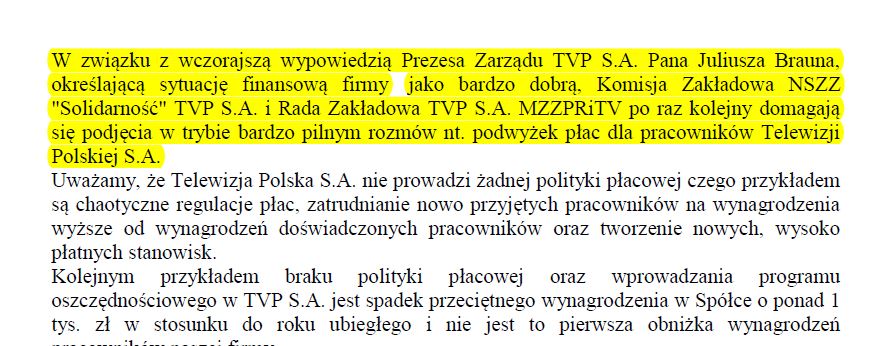 LIST OTWARTY PRZEWODNICZĄCEGO NSZZ SOLIDARNOŚĆ TVP S.A. DO WŁADZ SPÓŁKI