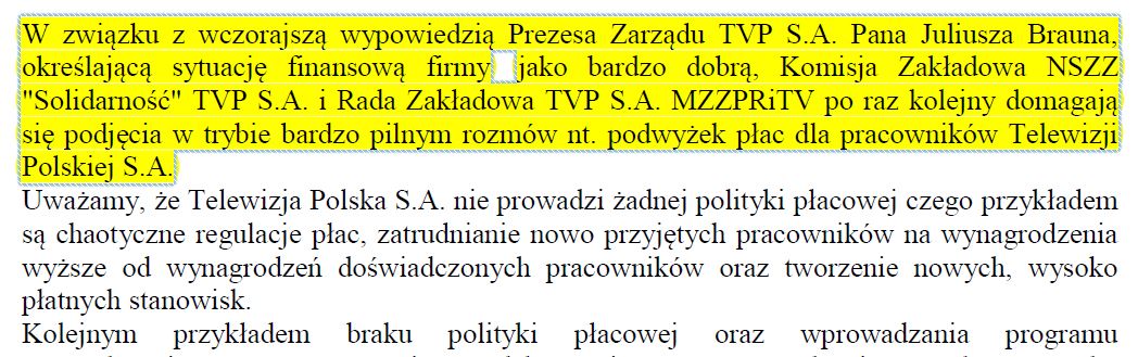 Obrady Rady Krajowego Sekretariatu Kultury i Środków Przekazu NSZZ Solidarność w siedzibie NSZZ Solidarności TVP S.A. | WESOŁYCH ŚWIĄT ŻYCZY KOMISJA ZAKŁADOWA NSZZ „SOLIDARNOŚĆ” TVP S.A. | komentarz: Nowa Umowa Opieki Medycznej | Dodatek świąteczny | TVP S.A. – KADRY INFORMUJĄ „Opieka medyczna dla pracowników i współpracowników” | „Polska znalazłaby się na 26. miejscu wśród 30 krajów europejskich pod względem inwestycji w media publiczne”. Media publiczne „w krytycznym stanie”. EBU apeluje do polskiego rządu | STANOWISKO KOMISJI ZAKŁADOWEJ NSZZ „SOLIDARNOŚĆ” TVP S.A. | Szef „Solidarności” odpowiada ministrze. Pracownicy TVP „obywatelami drugiej kategorii”? | Świadczenie świąteczne | Ministra kultury „Media publiczne pozostaną w likwidacji” | TVP na razie bez likwidacji kanałów. „Niedopuszczalne prawnie” | Europejskie organizacje apelują do polskiego rządu ws. finansowania mediów publicznych | Wielkopolska „Solidarność” nawołuje do przyspieszenia uregulowania sytuacji w mediach publicznych | SYTUACJA PRACOWNIKÓW W MEDIACH PUBLICZNYCH – audycja: Skazani na dialog – 27.09.2025 | SPAŁA 11-12 września: spotkanie struktur NSZZ Solidarność – Sekretariatu Kultury i Środków Przekazu i Rady Sekcji Pracowników Radia | Pierwsze Statuetki 45-lecia NSZZ „Solidarność” Regionu Mazowsze rozdane. Wśród laureatów wyróżnienia znaleźli się przedstawiciele NSZZ „Solidarność” TVP S.A. | Spotkanie z rodakami z Litwy | masz toksycznego szefa? jak radzić sobie z toksycznym szefem? | Przewodniczący NSZZ „Solidarność” Regionu Mazowsze Dariusz Paczuski w Radiu WNET | Co dalej ze stanem likwidacji w TVP. Nadal nie ma decyzji i działań. Rząd wciąż zwleka i odkłada decyzje w sprawie TVP na które wyczekują nie tylko pracownicy spółki. | OKIEM PRACOWNIKÓW „Za chwilę będziemy zarabiać jak pani w Żabce” | CO O NAS PISZĄ? | O CZYM SZUMIĄ MEDIA: TVP po wyborach prezydenckich – Czy TVP wyjdzie ze stanu likwidacji? Czy zakup praw do „Ligii Mistrzów” będzie ofiarą w sporze politycznym? | ODBYŁY SIĘ SZKOLENIA 06-08 MAJA | Obrady Komisja Krajowej i Krajowego Zjazdu Delegatów w Kołobrzegu | SAVOY W SPALE – WAKACYJNA OFERTA DLA CZŁONKÓW NSZZ SOLIDARNOŚĆ | XXXVI MIEDZYNARODOWY WYŚCIG KOLARSKI „SOLIDARNOŚCI” I OLIMPIJCZYKÓW W TELEWIZJI POLSKIEJ | WIELKANOC – WNIOSEK O PRZYZNANIE ŚWIADCZENIA ŚWIĄTECZNEGO | Władze Telewizji Polskiej zostały wybrane w sposób bezsprzecznie legalny i prawidłowy – wynika z pisemnego uzasadnienia wyroku sądu, które opublikowała Telewizja Polska | w piątek 7 lutego odbył się Protest NSZZ Solidarność podczas wizyty Komisji Europejskiej w Gdańsku | SZKOLENIE – z zakresu Ustawy o sygnalistach | Spotkanie struktur branżowych NSZZ Solidarności, przedstawicieli sekretariatów i sekcji branżowych z Prezydium Komisji Krajowej NSZZ Solidarność | O CZYM SZUMIA MEDIA : Rada Mediów Narodowych – media publiczne – proces likwidacyjny spółek | STANOWISKO ZARZADU REGIONU MAZOWSZE NSZZ „SOLIDARNOŚĆ” W SPRAWIE PLANÓW PRZYSZŁOŚCI TVP | O CZYM SZUMIĄ MEDIA CZYLI co o TVP się mówi? | KONSULTACJE ws ZMIAN W REGULAMINIE WYNAGRADZANIA | Stanowisko Rady KSKiŚP NSZZ „Solidarność” w sprawie prac nad ustawą medialną | Solidarni z ofiarami powodzi | TVP: „Moja i twoja nadzieja” ku pokrzepieniu oraz 2 mln zł na wsparcie ofiar powodzi od #RazemDlaWas | KRRiTV przekaże środki należne TVP. Zmiana decyzji z powodzią w tle i stawianiem warunków. | „RAZEM DLA WAS” TELEWIZJA POLSKA DLA POWODZIAN | O CZYM SZUMIĄ MEDIA – czyli o TVP mówi się… | PODZIĘKOWANIA OD POLSKICH DZIECI Z LITWY | FINANSOWANIE MEDIÓW PUBLICZNYCH – audycja „Skazani na dialog” z 06.07.2024 | SPAŁA 20-22 CZREWCA: wspólne posiedzenia struktur związkowych, spotkania z władzami związku, szkolenia integracja. | KRZYŻ WOLNOŚCI I SOLIDARNOŚCI DLA MARII JESIONKIEWICZ | TRZECIE POSTANOWIENIE SĄDU ODMAWIAJĄCE PRZEKAZANIA, NA WNIOSEK KRRiTV, DO DEPOZYTU ŚRODKÓW NALEŻNYCH TELEWIZJI PUBLICZNEJ | XXXV MIEDZYNARODOWY WYŚCIG KOLARSKI „SOLIDARNOŚCI” I OLIMPIJCZYKÓW | DZIAŁANIA STRUKTUR ZWIAZKU W KWESTII FINANSOWANIA MEDIÓW PUBLICZNYCH. | WAŻNE: ROZWIĄZANIE UMOWY ZA POROZUMIENIEM – CZY I DLA KOGO TO WYGODNE ROZSTANIE? MOŻE JEDNAK TO PROPOZYCJA NIE DO ODRZUCENIA TYLKO DLA PRACOWNIKA? | Koniec prawnych wątpliwości wokół legalności władz telewizji publicznej? | PRACODAWCA ZAPRASZA DO DIALOGU ORGANIZACJE ZWIĄZKOWE | KOMUNIKAT : SPOTKANIE WŁADZ SPÓŁKI Z PRZEDSTAWICIELAMI NSZZ SOLIDARNOŚĆ TVP S.A. | WAŻNE DONIESIENIA I ODDŹWIĘK MEDIALNY: | LIST OTWARTY PRZEWODNICZĄCEGO NSZZ SOLIDARNOŚĆ TVP S.A. DO WŁADZ SPÓŁKI | Brak zdecydowanych działań Pracodawcy w kwestii poprawy sytuacji pracowników | Krajowa Sekcja Pracowników Radia i Telewizji NSZZ Solidarność | TVP S.A. W MEDIACH | WAŻNE DONIESIENIA MEDIALNE: FINANSE – DECYZJE – LIKWIDACJA – ZMIANY – PODATKI | SZKOLENIA | KONTROLA | INFORMACJA DLA EMERYTÓW | REPREZENTATYWNOŚĆ | STANOWISKO: W SPRAWIE SYTUACJI PRACOWNIKÓW I WSPÓŁPRACOWNIKÓW TVP S.A. | APEL w sprawie finansowania mediów publicznych | sytuacja w TVP – wywiad | Wywiad z Przewodniczącym KSPRiTV, KSKiŚP Wiesławem Murzynem | Artykuł na stronie tygodnika NSZZ Region Mazowsze „Solidarność” i w „Tygodniku Solidarność” | Stanowisko Krajowego Sekretariatu Kultury i Środków Przekazu NSZZ „Solidarność” | Oświadczenie Przewodniczącego NSZZ Solidarność Piotra Dudy i Stanowisko Przewodniczącego NSZZ Solidarność Regionu Mazowsze Dariusza Paczuskiego oraz stanowisko Krajowej Sekcji Pracowników Radia i Telewizji NSZZ Solidarność | KOMUNIKAT