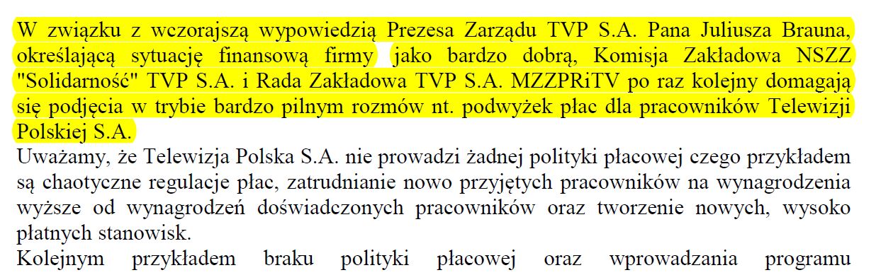 LIST OTWARTY PRZEWODNICZĄCEGO NSZZ SOLIDARNOŚĆ TVP S.A. DO WŁADZ SPÓŁKI