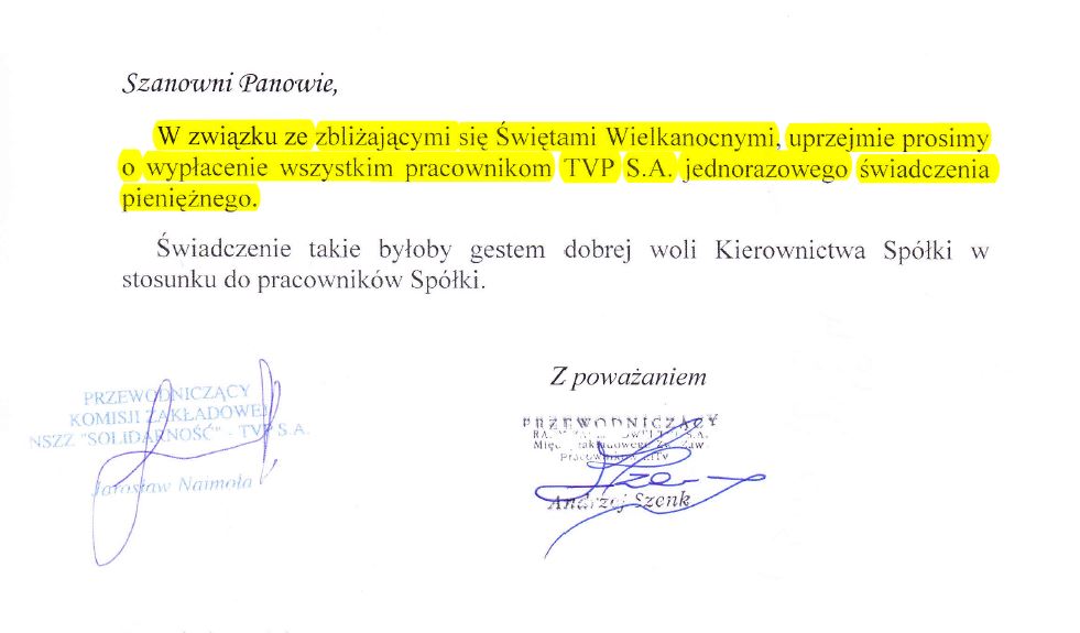 LIST OTWARTY PRZEWODNICZĄCEGO NSZZ SOLIDARNOŚĆ TVP S.A. DO WŁADZ SPÓŁKI