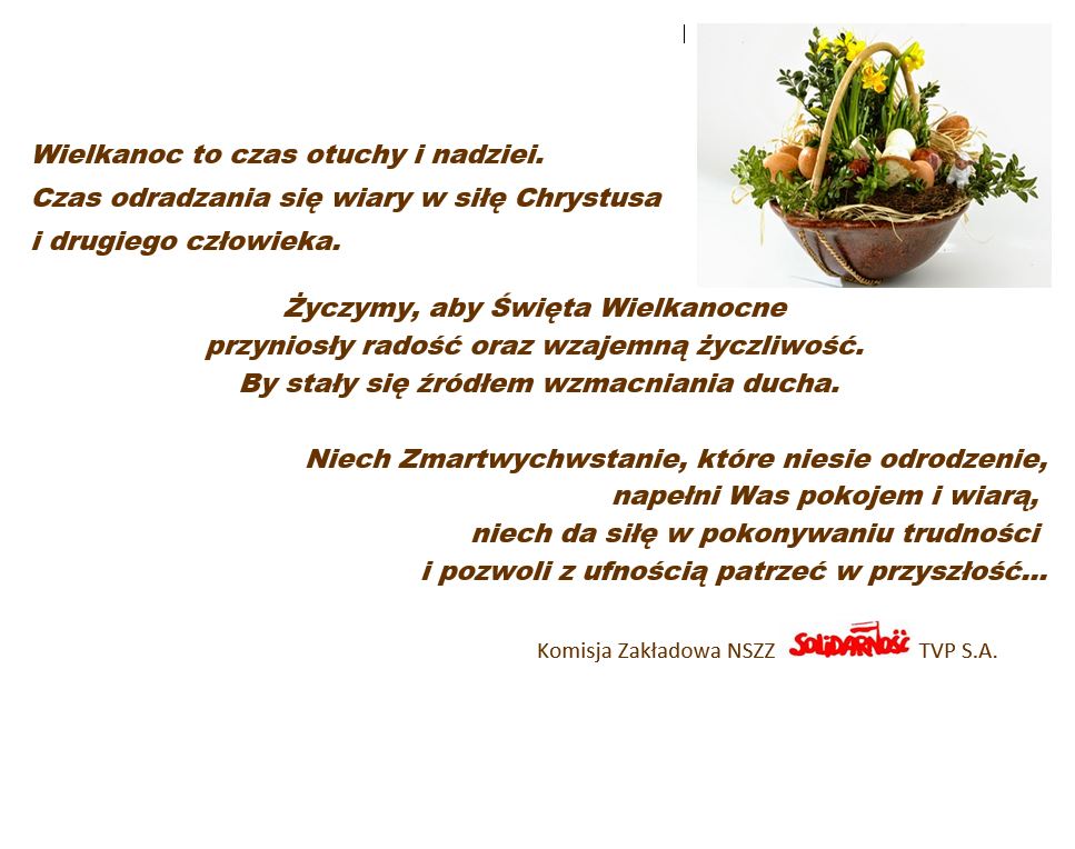 Obrady Rady Krajowego Sekretariatu Kultury i Środków Przekazu NSZZ Solidarność w siedzibie NSZZ Solidarności TVP S.A. | WESOŁYCH ŚWIĄT ŻYCZY KOMISJA ZAKŁADOWA NSZZ „SOLIDARNOŚĆ” TVP S.A. | komentarz: Nowa Umowa Opieki Medycznej | Dodatek świąteczny | TVP S.A. – KADRY INFORMUJĄ „Opieka medyczna dla pracowników i współpracowników” | „Polska znalazłaby się na 26. miejscu wśród 30 krajów europejskich pod względem inwestycji w media publiczne”. Media publiczne „w krytycznym stanie”. EBU apeluje do polskiego rządu | STANOWISKO KOMISJI ZAKŁADOWEJ NSZZ „SOLIDARNOŚĆ” TVP S.A. | Szef „Solidarności” odpowiada ministrze. Pracownicy TVP „obywatelami drugiej kategorii”? | Świadczenie świąteczne | Ministra kultury „Media publiczne pozostaną w likwidacji” | TVP na razie bez likwidacji kanałów. „Niedopuszczalne prawnie” | Europejskie organizacje apelują do polskiego rządu ws. finansowania mediów publicznych | Wielkopolska „Solidarność” nawołuje do przyspieszenia uregulowania sytuacji w mediach publicznych | SYTUACJA PRACOWNIKÓW W MEDIACH PUBLICZNYCH – audycja: Skazani na dialog – 27.09.2025 | SPAŁA 11-12 września: spotkanie struktur NSZZ Solidarność – Sekretariatu Kultury i Środków Przekazu i Rady Sekcji Pracowników Radia | Pierwsze Statuetki 45-lecia NSZZ „Solidarność” Regionu Mazowsze rozdane. Wśród laureatów wyróżnienia znaleźli się przedstawiciele NSZZ „Solidarność” TVP S.A. | Spotkanie z rodakami z Litwy | masz toksycznego szefa? jak radzić sobie z toksycznym szefem? | Przewodniczący NSZZ „Solidarność” Regionu Mazowsze Dariusz Paczuski w Radiu WNET | Co dalej ze stanem likwidacji w TVP. Nadal nie ma decyzji i działań. Rząd wciąż zwleka i odkłada decyzje w sprawie TVP na które wyczekują nie tylko pracownicy spółki. | OKIEM PRACOWNIKÓW „Za chwilę będziemy zarabiać jak pani w Żabce” | CO O NAS PISZĄ? | O CZYM SZUMIĄ MEDIA: TVP po wyborach prezydenckich – Czy TVP wyjdzie ze stanu likwidacji? Czy zakup praw do „Ligii Mistrzów” będzie ofiarą w sporze politycznym? | ODBYŁY SIĘ SZKOLENIA 06-08 MAJA | Obrady Komisja Krajowej i Krajowego Zjazdu Delegatów w Kołobrzegu | SAVOY W SPALE – WAKACYJNA OFERTA DLA CZŁONKÓW NSZZ SOLIDARNOŚĆ | XXXVI MIEDZYNARODOWY WYŚCIG KOLARSKI „SOLIDARNOŚCI” I OLIMPIJCZYKÓW W TELEWIZJI POLSKIEJ | WIELKANOC – WNIOSEK O PRZYZNANIE ŚWIADCZENIA ŚWIĄTECZNEGO | Władze Telewizji Polskiej zostały wybrane w sposób bezsprzecznie legalny i prawidłowy – wynika z pisemnego uzasadnienia wyroku sądu, które opublikowała Telewizja Polska | w piątek 7 lutego odbył się Protest NSZZ Solidarność podczas wizyty Komisji Europejskiej w Gdańsku | SZKOLENIE – z zakresu Ustawy o sygnalistach | Spotkanie struktur branżowych NSZZ Solidarności, przedstawicieli sekretariatów i sekcji branżowych z Prezydium Komisji Krajowej NSZZ Solidarność | O CZYM SZUMIA MEDIA : Rada Mediów Narodowych – media publiczne – proces likwidacyjny spółek | STANOWISKO ZARZADU REGIONU MAZOWSZE NSZZ „SOLIDARNOŚĆ” W SPRAWIE PLANÓW PRZYSZŁOŚCI TVP | O CZYM SZUMIĄ MEDIA CZYLI co o TVP się mówi? | KONSULTACJE ws ZMIAN W REGULAMINIE WYNAGRADZANIA | Stanowisko Rady KSKiŚP NSZZ „Solidarność” w sprawie prac nad ustawą medialną | Solidarni z ofiarami powodzi | TVP: „Moja i twoja nadzieja” ku pokrzepieniu oraz 2 mln zł na wsparcie ofiar powodzi od #RazemDlaWas | KRRiTV przekaże środki należne TVP. Zmiana decyzji z powodzią w tle i stawianiem warunków. | „RAZEM DLA WAS” TELEWIZJA POLSKA DLA POWODZIAN | O CZYM SZUMIĄ MEDIA – czyli o TVP mówi się… | PODZIĘKOWANIA OD POLSKICH DZIECI Z LITWY | FINANSOWANIE MEDIÓW PUBLICZNYCH – audycja „Skazani na dialog” z 06.07.2024 | SPAŁA 20-22 CZREWCA: wspólne posiedzenia struktur związkowych, spotkania z władzami związku, szkolenia integracja. | KRZYŻ WOLNOŚCI I SOLIDARNOŚCI DLA MARII JESIONKIEWICZ | TRZECIE POSTANOWIENIE SĄDU ODMAWIAJĄCE PRZEKAZANIA, NA WNIOSEK KRRiTV, DO DEPOZYTU ŚRODKÓW NALEŻNYCH TELEWIZJI PUBLICZNEJ | XXXV MIEDZYNARODOWY WYŚCIG KOLARSKI „SOLIDARNOŚCI” I OLIMPIJCZYKÓW | DZIAŁANIA STRUKTUR ZWIAZKU W KWESTII FINANSOWANIA MEDIÓW PUBLICZNYCH. | WAŻNE: ROZWIĄZANIE UMOWY ZA POROZUMIENIEM – CZY I DLA KOGO TO WYGODNE ROZSTANIE? MOŻE JEDNAK TO PROPOZYCJA NIE DO ODRZUCENIA TYLKO DLA PRACOWNIKA? | Koniec prawnych wątpliwości wokół legalności władz telewizji publicznej? | PRACODAWCA ZAPRASZA DO DIALOGU ORGANIZACJE ZWIĄZKOWE | KOMUNIKAT : SPOTKANIE WŁADZ SPÓŁKI Z PRZEDSTAWICIELAMI NSZZ SOLIDARNOŚĆ TVP S.A. | WAŻNE DONIESIENIA I ODDŹWIĘK MEDIALNY: | LIST OTWARTY PRZEWODNICZĄCEGO NSZZ SOLIDARNOŚĆ TVP S.A. DO WŁADZ SPÓŁKI | Brak zdecydowanych działań Pracodawcy w kwestii poprawy sytuacji pracowników | Krajowa Sekcja Pracowników Radia i Telewizji NSZZ Solidarność | TVP S.A. W MEDIACH | WAŻNE DONIESIENIA MEDIALNE: FINANSE – DECYZJE – LIKWIDACJA – ZMIANY – PODATKI | SZKOLENIA | KONTROLA | INFORMACJA DLA EMERYTÓW | REPREZENTATYWNOŚĆ | STANOWISKO: W SPRAWIE SYTUACJI PRACOWNIKÓW I WSPÓŁPRACOWNIKÓW TVP S.A. | APEL w sprawie finansowania mediów publicznych | sytuacja w TVP – wywiad | Wywiad z Przewodniczącym KSPRiTV, KSKiŚP Wiesławem Murzynem | Artykuł na stronie tygodnika NSZZ Region Mazowsze „Solidarność” i w „Tygodniku Solidarność” | Stanowisko Krajowego Sekretariatu Kultury i Środków Przekazu NSZZ „Solidarność” | Oświadczenie Przewodniczącego NSZZ Solidarność Piotra Dudy i Stanowisko Przewodniczącego NSZZ Solidarność Regionu Mazowsze Dariusza Paczuskiego oraz stanowisko Krajowej Sekcji Pracowników Radia i Telewizji NSZZ Solidarność | KOMUNIKAT